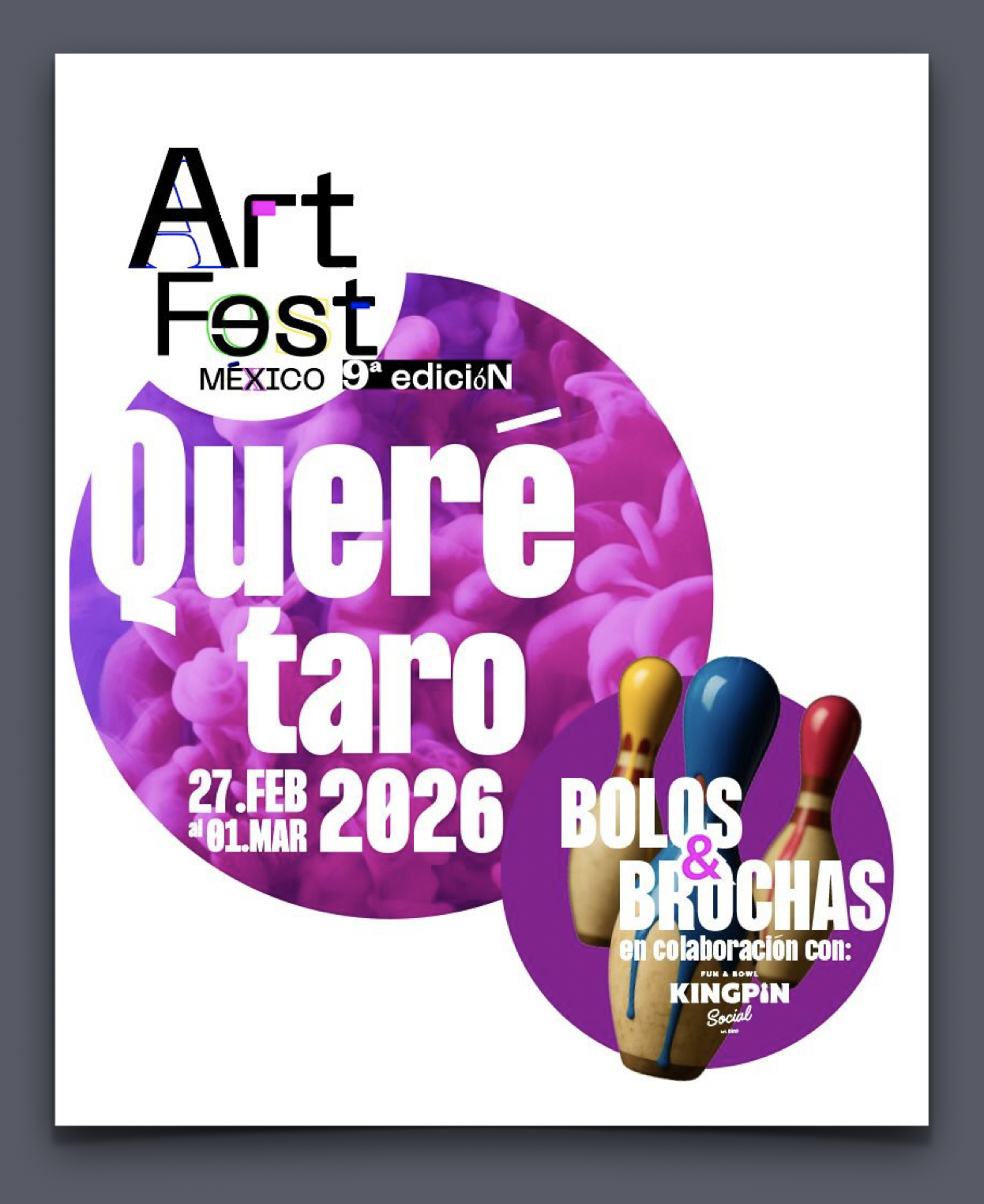 Participa con la intervención de un bolo, en la exposición colectiva "Bolos y Brochas" que pertenece a los eventos del Art Fest México (9ª edición) en Querétaro se llevará a cabo del 27 de febrero al 1 de marzo de 2026 en The Hub Cuadrante Centro Sur. Este evento de arte, con más de 100 artistas y expositores, contará con espacios de exhibición, jardines y propuestas culturales en esta sede.